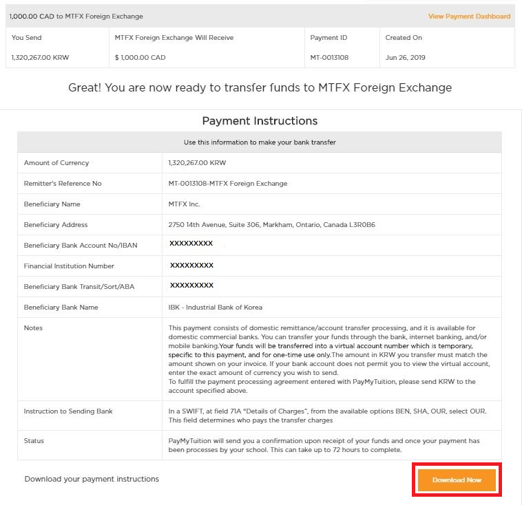 Once the bank has been selected, you will be provided the bank details for the specific bank you have chosen. These payment instructions can also be downloaded for your reference by clicking the Download Now.